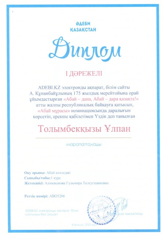 М.Мақатаев оқуларына «Абай колледжі» КММ - нің студенті Садуова А.З. мәнерлеп оқуда 3 - орын алып дипломмен марапатталды.