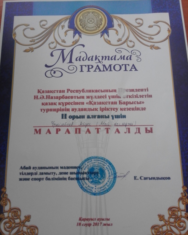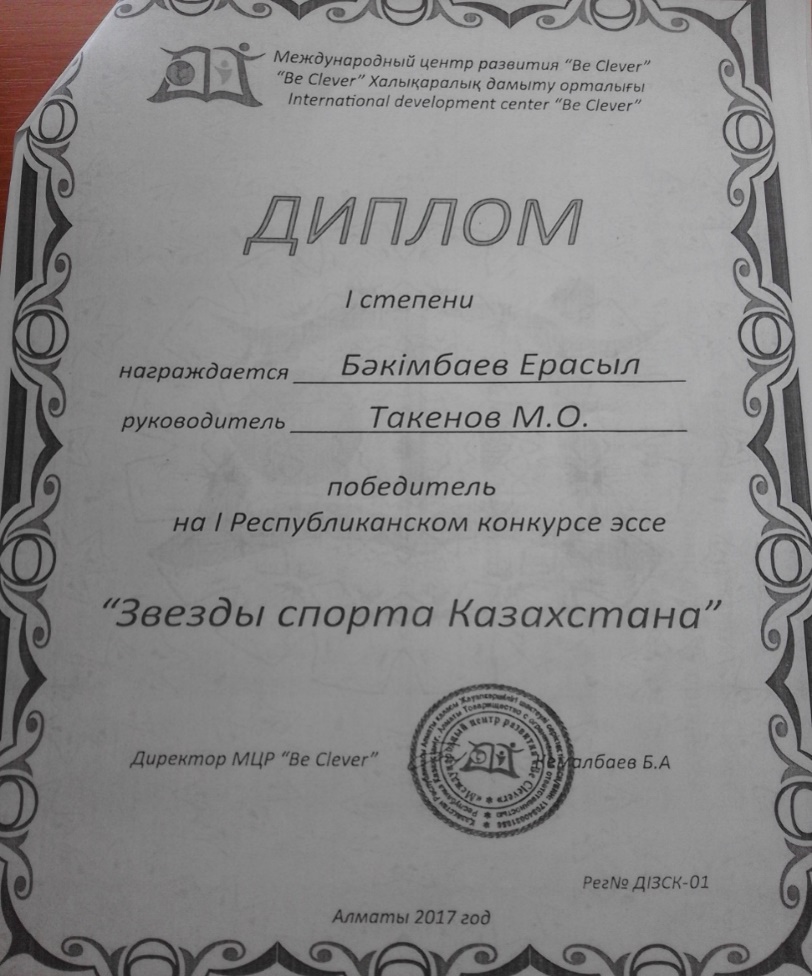 Мамыр айының 1-күні «Қазақстан спорт жұлдыздары» тақырыбында өткен республикалық білім сайысында І-ші дәрежелі дипломмен Бәкімбаев Ерасыл және жетекшісі дене тәрбиесі пәнінің мұғалімі Такенов Мұхтар арнайы дипломмен марапатталды.