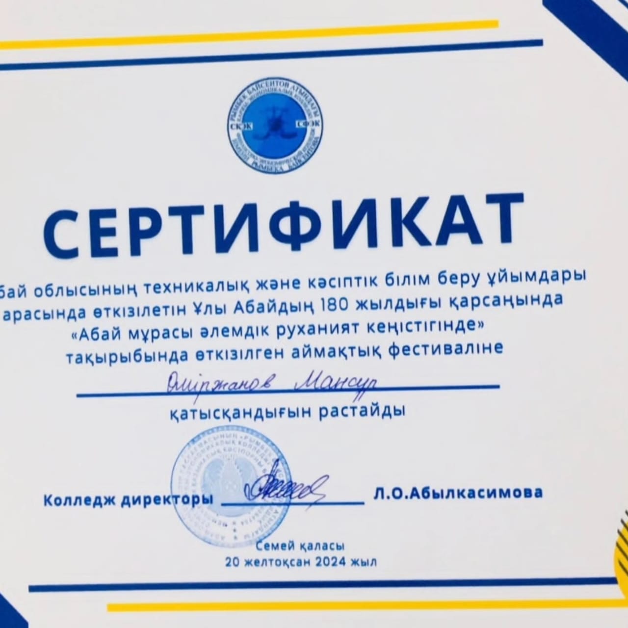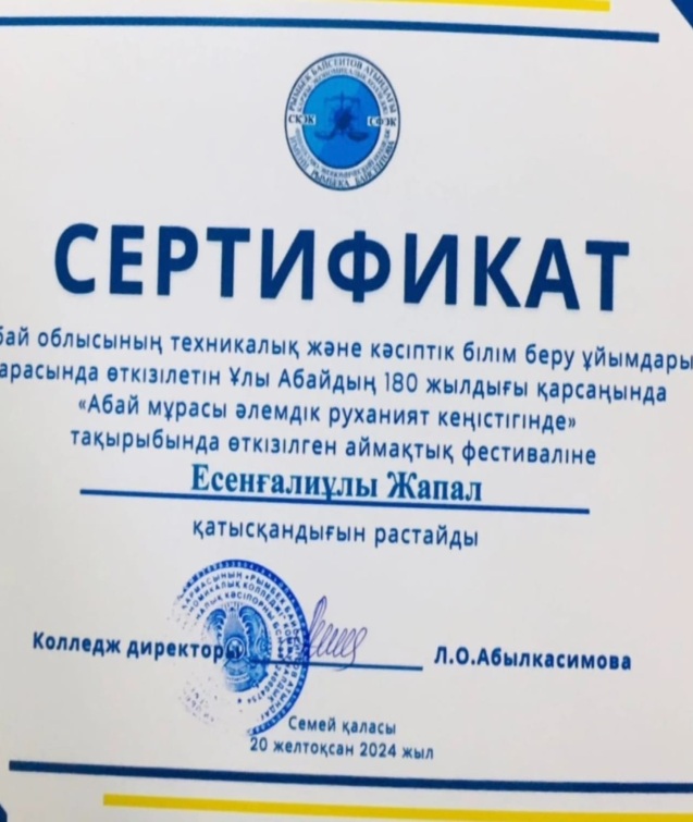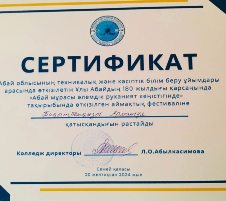 Ұлы Абайдың 180 жылдығы қарсаңында "Рымбек Байсеитов атындағы Семей қаржы - экономикалық колледжінің" ұйымдастырумен "Абай мұрасы әлемдік руханият кеңістігінде" тақырыбымен өткен аймақтық фестивальға колледж студенттері мен жетекшілері қатысып , сертификаттар мен арнайы дипломмен марапатталды.